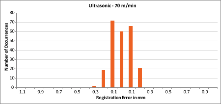 Les capteurs à ultrasons ont l'avantage de détecter la plus large gamme de matériaux. Mais ils sont les moins précis de toutes les technologies de capteurs d'étiquettes. Leur précision est directement liée à la vitesse et à la précision de la bande en continu, bien qu'elle diminue peu à mesure que la vitesse augmente.